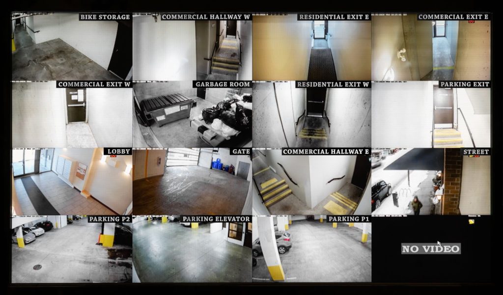 Live security camera monitoring is a key feature, allowing for real-time surveillance of office buildings and enhancing security through CCTV in buildings.